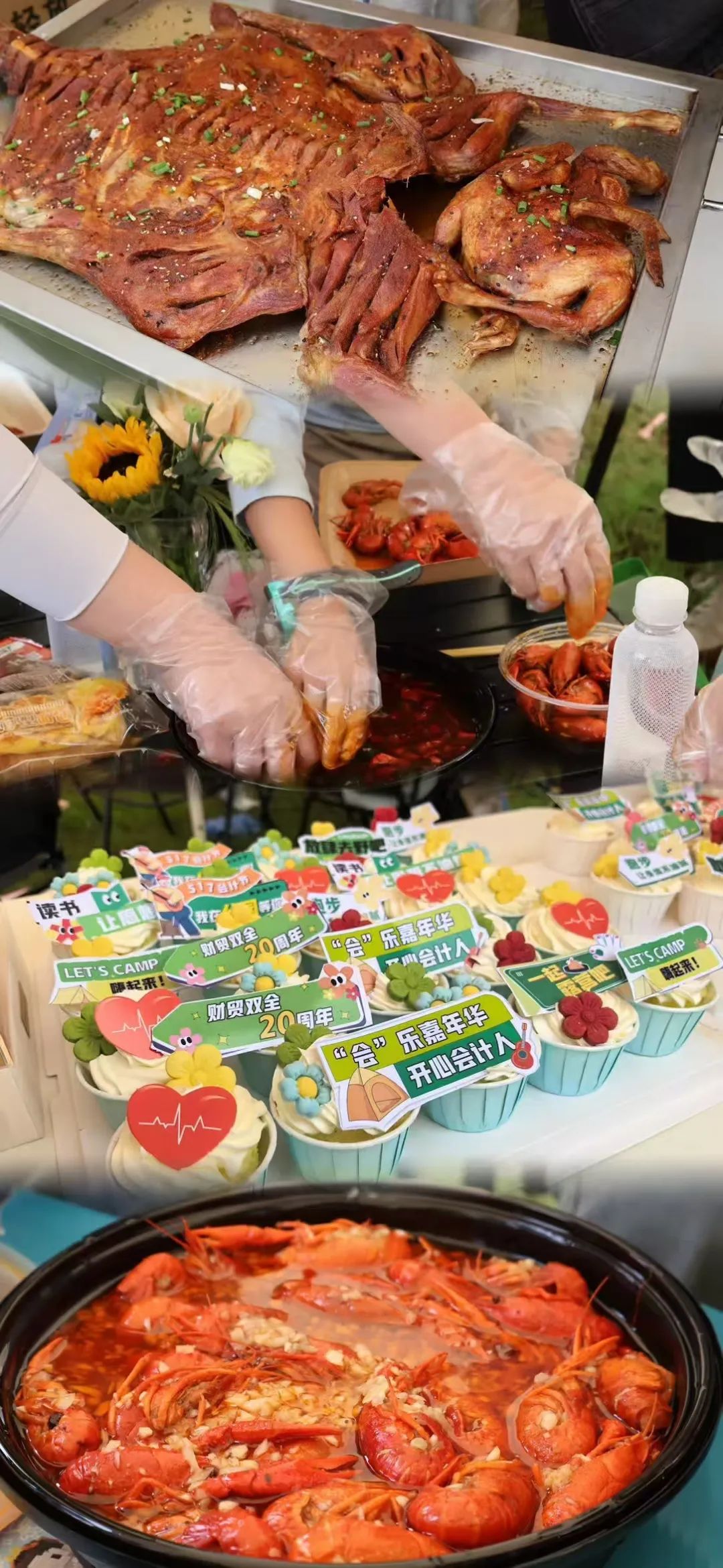 美食盛宴,味蕾狂欢玩累了?别急!烤全羊香气扑鼻而来,鲜嫩肉质搭配秘制酱料,一口沦陷;麻辣小龙虾鲜香爆汁,嗦到停不下来;定制小蛋糕精致又美味,甜蜜直击心间~大家围坐分享美食,聊聊工作与生活,幸福感满满!