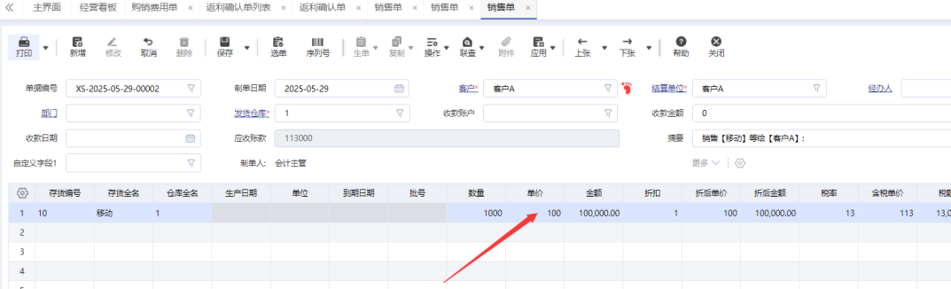 ① 销售单返利打开销售单,录入数据后,点击单据页面上方操作–使用返利,录入返利金额后点击确定,系统会根据录入的返利金额再反算返利后单据上的金额和单价,通过减少应收的方式给客户进行返利。