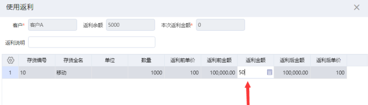 购销费用单返利和其他出库单返利的操作跟以上2种方式一致,打开单据点击操作–使用返利录入返利金额即可。