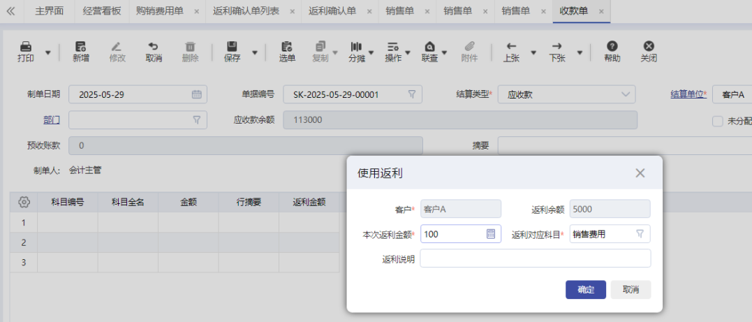 ② 收款单返利打开收款单,点击操作--使用返利,录入返利金额。录入后,会将返利设置里的默认科目自动带入到收款单表体,这个操作相当于用费用科目来结算了客户的应收,减少了应收账款。